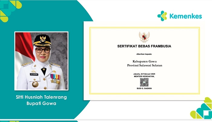 INFOKINI.ID, GOWA – Pemerintah Kabupaten Gowa menerima Sertifikat Bebas Frambusia dari Kementerian Kesehatan Republik Indonesia.