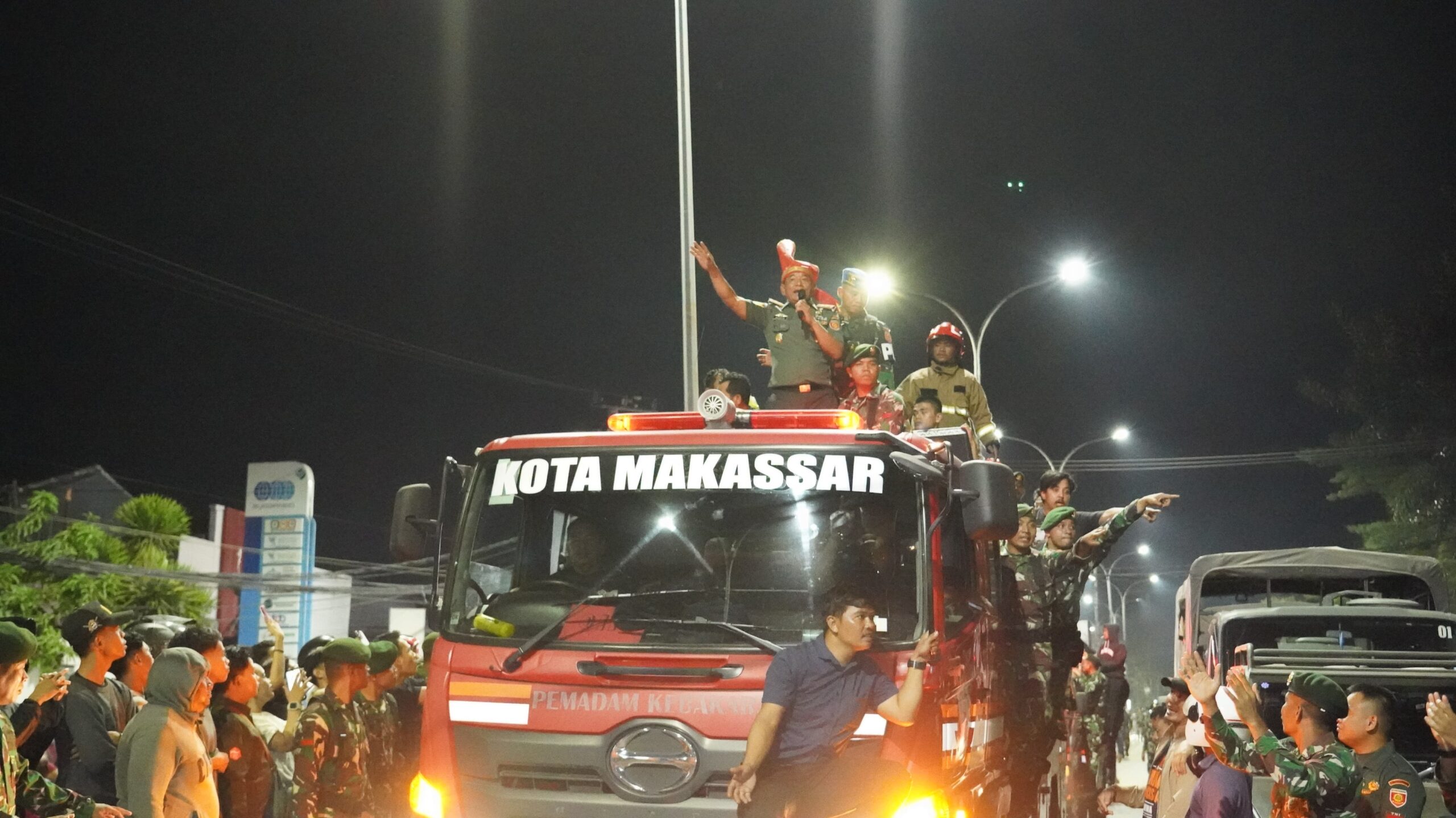 INFOKINI.ID, MAKASSAR– Aksi Pangdivid 3 Kostrad Mayjen TNI Bangun Nawoko menyita perhatian. Di tengah kerumunan massa aksi demonstrasi dan masyarakat yang memadati jalan menuju gedung DPRD Sulawesi Selatan yang terbakar, jenderal bintang dua tersebut dengan gerak cepat membantu mobil pemadam kebakaran, pada Jumat (29/8/2025) tengah malam. Tak tanggung-tanggung, Pangdivif naik ke mobil pemadam dan meminta massa membuka akses jalan agar kendaraan pemadam kebakaran bisa segera beraksi padamkan si jago merah yang ganas melahap gedung DPRD Sulsel.