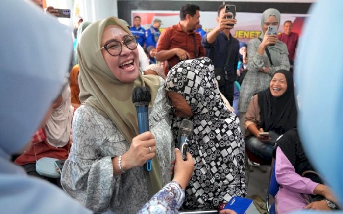 Bupati Gowa, Sitti Husniah Talenrang saat acara penyerahan bantuan dari Kemensos, Jumat (5/9/2025).