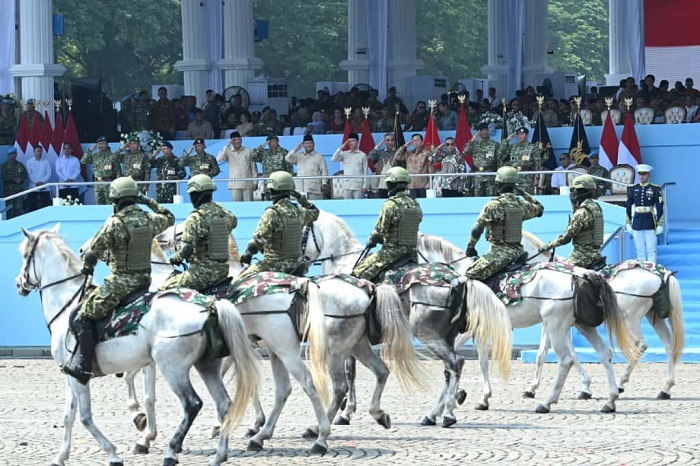 Defile pasukan berkuda yang merupakan rangkaian pertunjukan militer yang menjadi puncak peringatan Hari Ulang Tahun ke-80 Tentara Nasional Indonesia (TNI). (setneg.go.id)