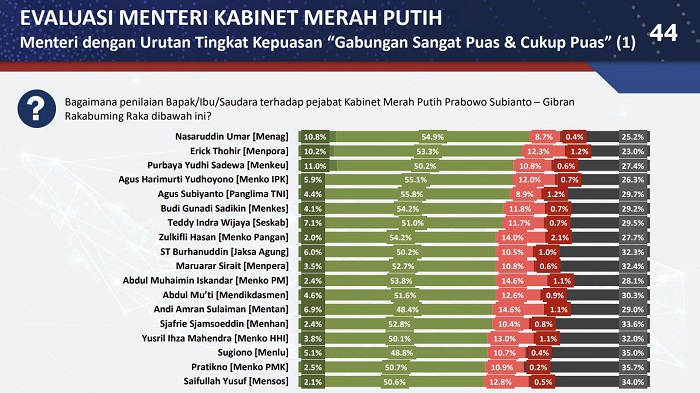 Berikut menteri dengan tingkat kepuasan tertinggi berdasarkan Survei Poltracking Indonesia, 3 – 10 Oktober 2025 terhadap 1.220 responden: