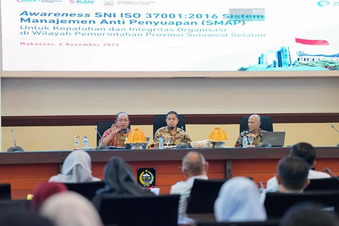 INFOKINI.ID, MAKASSAR – Asisten 1 Bidang Pemerintahan Setda Provinsi Sulawesi Selatan, Ishak Iskandar membuka kegiatan kegiatan Awareness SNI ISO 37001:2016 Sistem Manajemen Anti Penyuapan (SMAP) untuk kepatuhan dan integritas organisasi di lingkungan Pemerintah Provinsi Sulawesi Selatan di Ruang Rapat Pimpinan Kantor Gubernur Sulsel, Kamis 6 November 2025.