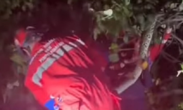 Sejumlah personel Damkarmat Kota Makassar kemudian turun mendatangi lokasi untuk mengevakuasi ular tersebut. Saat hendak dievakuasi, terlihat ular melilit di ranting pohon.