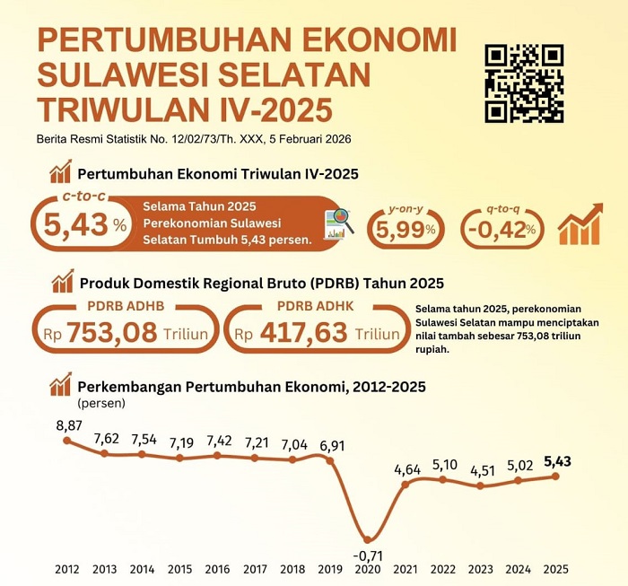 Pertumbuhan ekonomi 2025 ini lebih tinggi dibandingkan tahun 2024 yang tercatat sebesar 5,02 persen. BPS mencatat, pada Triwulan IV-2025, ekonomi Sulsel tumbuh 5,99 persen secara year-on-year, meskipun secara triwulanan mengalami kontraksi 0,42 persen (quarter-to-quarter/q-to-q).