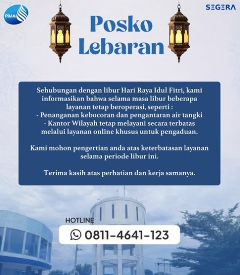 Untuk memudahkan masyarakat dalam menyampaikan laporan maupun pengaduan, Perumda Air Minum Kota Makassar turut mencantumkan nomor hotline 0811-4641-123 yang dapat dihubungi selama periode layanan berlangsung.