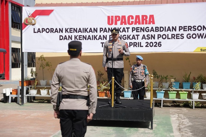 INFOKINI.ID, GOWA – Kapolres Gowa Muhammad Aldy Sulaiman memimpin langsung upacara korps raport kenaikan pangkat pengabdian Polri dan kenaikan pangkat reguler ASN Polres Gowa TMT 1 April 2026. Kegiatan berlangsung di Lapangan Apel Griya Bhayangkara Polres Gowa, Kamis (2/4/2026) pagi.