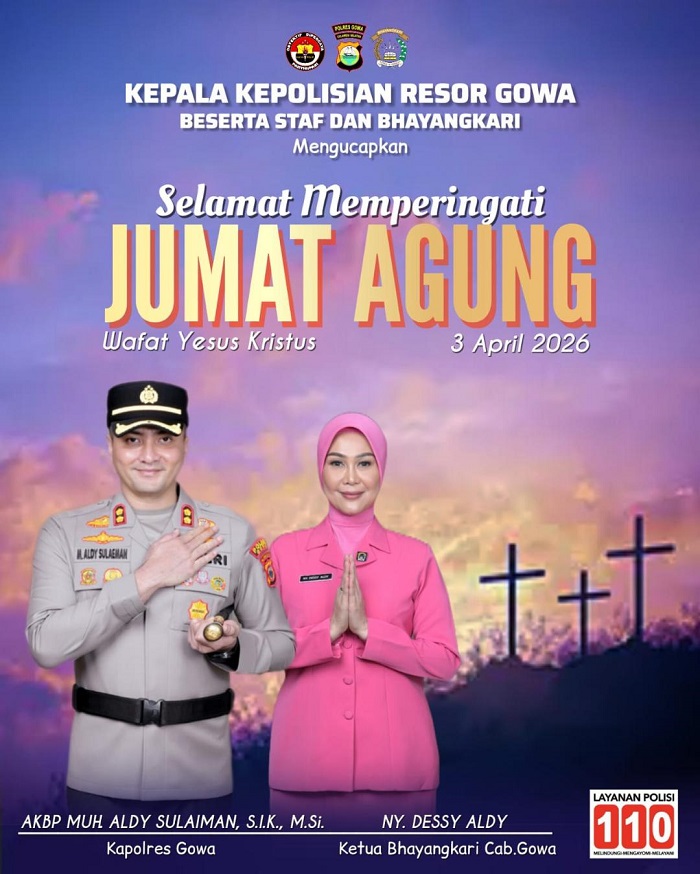 INFOKINI.ID, GOWA – Kepala Kepolisian Resor Gowa AKBP Muhammad Aldy Sulaiman, bersama staf dan Bhayangkari menyampaikan ucapan Selamat Memperingati Jumat Agung kepada seluruh umat Kristiani, Jumat (3/4/2026).