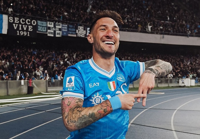 Pemain Napoli Matteo Politano melakukan selebrasi usai mencetak gol ke gawang AC Milan pada laga Liga Italia pekan ke-31, di Stadion Diego Armando Maradona pada Selasa dini hari WIB (7/4/2026). Napoli menang dengan skor tipis 1-0. (Foto: X/@sscnapoli)